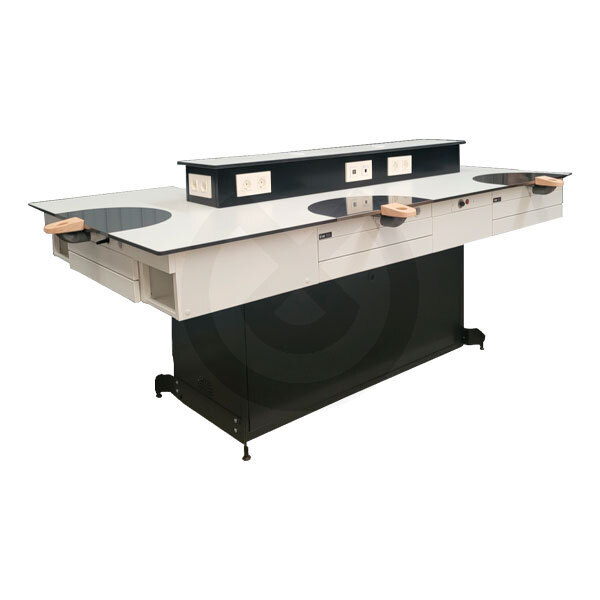 Es una mesa, que puede albergar 4, 5, 6, 7, 8, 9 y 10 puestos de trabajo para protésico. Las opciones de personalización son muy grandes.