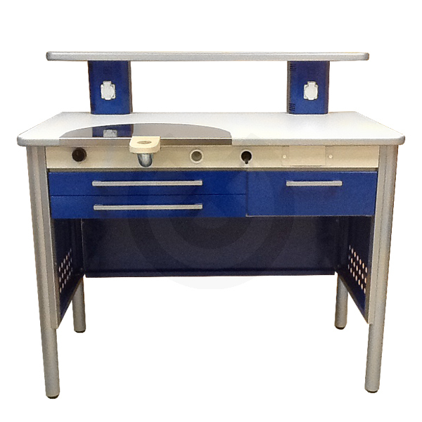 MESA KAPPA UN PUESTO DE TRABAJO mesa que dispone de serie de toma para aspiración, llave de gas, soplador retráctil, hueco para montar sistema retráctil de micromotor, bandeja porta trabajos con dos tomas de corriente, modulo lateral de 1 cajon. Encimera estándar de sándwich blanco canteada en pvc. incluye una astillera de trabajo. Cuerpo del mueble y frentes de cajón metálicos (Posibilidad de elegir los frentes en formica con canto de PVC). Tirador de asa en todos los frentes. Dimensiones mesa Kappa de un puesto: Altura 90, Anchura 116, Fondo 65. (Medidas en cm).