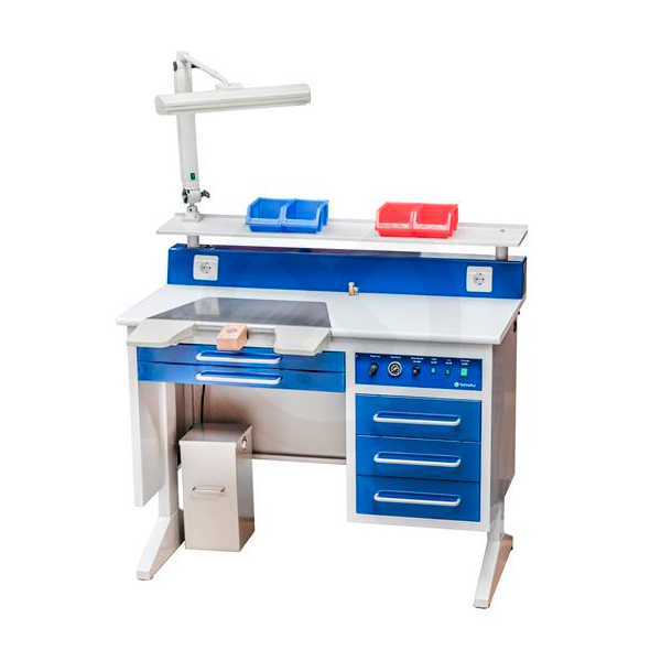 La mesa de trabajo de Tecnnoflux para laboratorio dental está construida con bastidor en acero y planchas metálicas de alta densidad y resistentes al fuego.