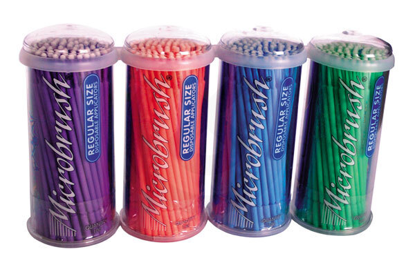 Aplicador de bolita de fibras no absorbentes y que no se deshilachan. Los líquidos son retenidos en forma de una pequeña gota entre las fibras hasta su aplicación. Microbrush puede doblarse fácilmente por su cuello para llegar a cualquier lugar. Presentados en distribuidor redondo; 4 colores x 100 unidades de cada color. Microbrush Plus: mango más largo y grueso para una mejor sujeción. Envase de 400 unidades en 4 colores y dispensador 'uno a uno'.