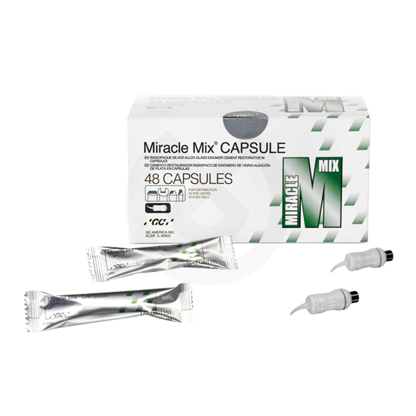 Miracle Mix ofrece la fórmula probada de cemento de ionómero de vidrio 100% fino, polvo de aleación de plata para la acumulación duradera del núcleo, bloqueos y reparación.