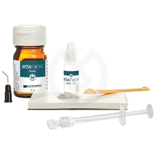 Fácil de mezclar, fácil de aplicar. El cemento de reparación de agregado de trióxido mineral MTAFlow, está diseñado para permitir una mezcla rápida y sencilla y conseguir así una masilla con la consistencia adecuada para una amplia variedad de procedimientos. Además, permite su uso a través de las puntas y jeringas de Ultradent, por lo que es capaz de ofrecer aplicaciones de gran precisión y eficacia. El cemento de reparación MTA Flow puede adaptarse a distintos tipos de tratamientos al poder variar las proporciones del polvo y del gel suministrados para realizar la mezcla. Una consistencia más espesa es más adecuada para procedimientos de cobertura pulpar, perforaciones de cámara pulpar y pulpotomía; una consistencia más fluida permite conseguir una mayor precisión en procedimientos como la apexificación, la reabsorción o el tapón apical; una consistencia tipo masilla, es ideal para procedimientos de relleno radicular.
