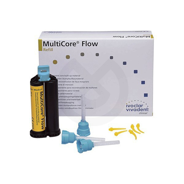 Color medium.Material para la elaboración de muñones basado en composite autopolimerizable, con opción de fotopolimerización, radiopaco y de alt o contenido en relleno. Multicore está disponible en 2 viscosidades: - M ulticore Flow (inyectable): en doble cartucho con cánulas de automezcla para la elaboración de muñones utilizando matrices. Multicore HB (modela ble): presentado en 2 Jeringas pasta-pasta para la mezcla manual y elabo ración de muñones mediante modelado. No se adhiere al instrumento.