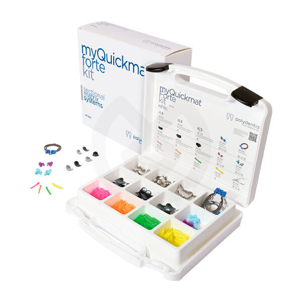 60 u LumiContrast matrices seccionales + 20u Premolar 0,04mm/5mm + 20u Molar 0,04mm/ 6,4mm + 20u con extensión 0,04mm/ 6,4mm + 2u myRing Forte + 2 pares reposición de extremos + 180u myWedge + 50u X-Small + 50u Small + 40u Medium + 40u Large + 1u myForceps