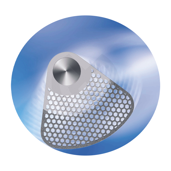Komet ha desarrollado una solución fiable para un stripping oscilante seguro y eficiente. El nuevo disco de segmento oscilante de 60° convence por su tamaño: con un radio de 1,4 cm y un Ángulo de giro de 30°, puede aplicarse incluso en condiciones de espacio muy reducidas. No necesita protector de disco. En comparación con los discos rotatorios de radio completo con diámetros de hasta 2,2 cm, que además requieren añadir protector de disco, el disco de segmentos ofrece las mejores condiciones para el stripping en zonas de difícil acceso. Con el diseño patentado en panal del disco segmentado oscilante dispone Ud. de un innovador instrumento que consigue unos resultados de tratamiento convincentes gracias a su óptima visibilidad y buen transporte de virutas.