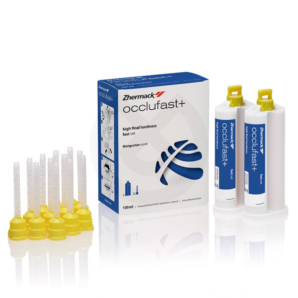 Occlufast+ es una silicona de adición que ofrece un alto grado de dureza final y está pensada para conseguir la mayor fiabilidad y exactitud en la creación de registros oclusales. Tiempo de trabajo: 0:30'. Tiempo en boca: 1:00'. Reproducción de detalles 20 μm. Variación lineal de dimensiones (tras 24 h) 0,20 %. Dureza: 37±5 Shore D. Aroma a mangostán.