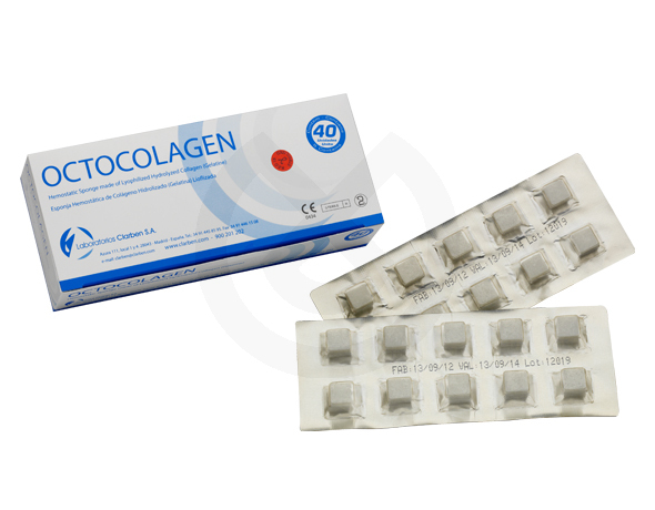 Octocolagen es una esponja de gelatina liofilizada estéril, de forma cúbica, de peso no inferior a 10mg que proporciona una acción hemostática y cicatrizante y es completamente reabsorbible por el organismo en un período de 15 días. Se presenta listo para uso, y acondicionado individualmente en blíster. 4 blíster de 10 cubos de 10x10x10mm cada uno.