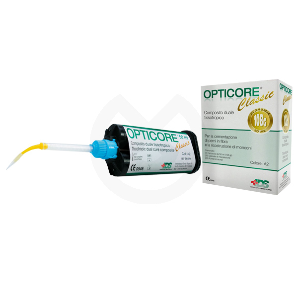 Opticore Classic es un composite dual tixotrópico para cementación y reconstrución con pernos de fibra. Combina calidad y conveniencia gracias al económico cartucho de 50 ml (88 g) que utiliza los dispensadores de silicona ya incluidos en el mismo pack.