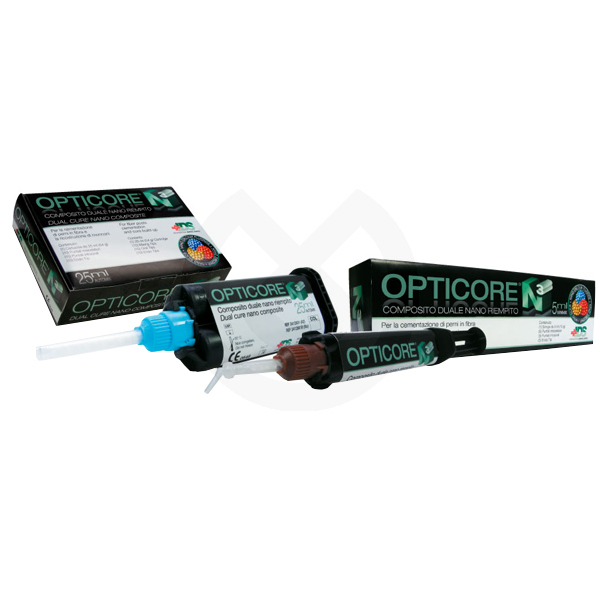 Composite nano y dual para la cementación de pernos y reconstrucción simultánea de muñones. Gracias a los nano rellenos de fluoruro de calcio y dióxido de zirconio, Opticore N3 tiene propiedades de remineralización, radiopacidad y translucidez