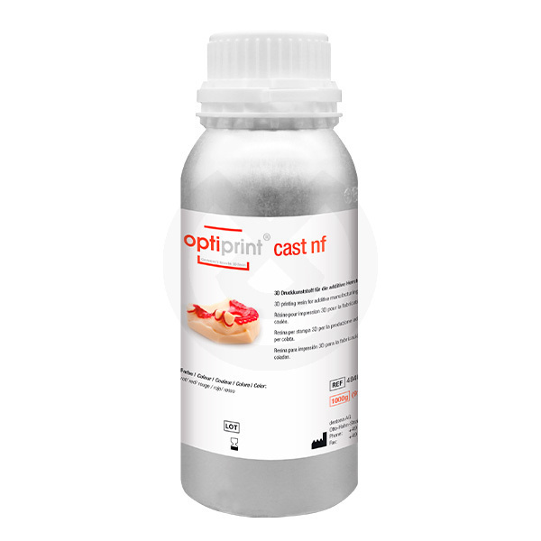 La resina de impresión dental 3D optiprint cast nf lleva el proceso CAD/cast a un nuevo nivel. La resina de primera calidad, que se quema sin dejar residuos, impresiona por su precisión, sus superficies lisas y sus objetos colados sin distorsiones: la base para estructuras de colado de modelos de alta precisión, así como coronas y puentes metálicos. Unas estructuras de soporte muy delicadas garantizan piezas coladas sin distorsiones. Las superficies lisas simplifican los pasos de trabajo manual tras el colado (por ejemplo, el pulido). Incluso las estructuras superficiales más finas se reproducen con todo detalle.