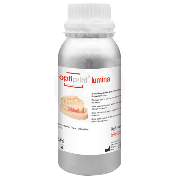 Optiprint lumina (385-405 nm) es la nueva resina de impresión 3D translúcida para dientes de aspecto natural con alto relleno, optiprint lumina combina un excelente ajuste de los bordes con resistencia y estética. Gracias a los colores de dientes disponibles (escala de colores de dientes VITA) se satisfacen las altas exigencias estéticas sin necesidad de retoques adicionales. Además, las restauraciones se pueden individualizar, si es necesario, fácilmente con composite. La edición y el pulido son extremadamente fáciles. Se excluye una sedimentación del material en la botella o en la bandeja de material.