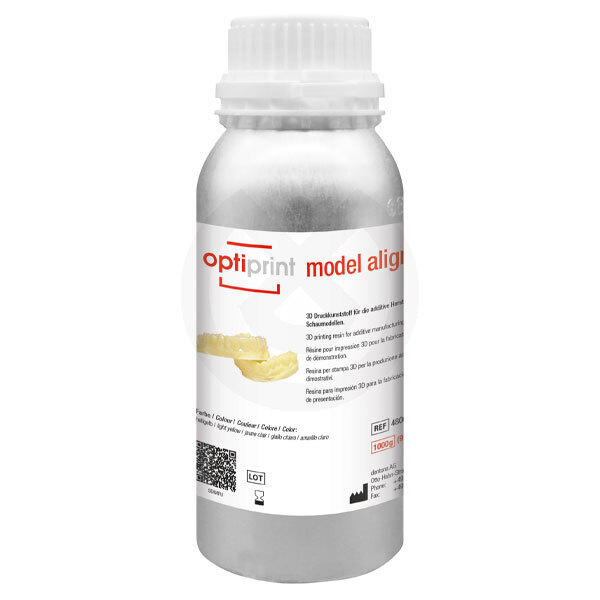 Variante de material especial de alta dureza para modelos de ortodoncia y Aligner. Esta resina especial se adapta a los requisitos del modelo de la tecnología de termoformado y garantiza al técnico un alto nivel de fiabilidad del proceso. Por ejemplo, optiprint model align es particularmente adecuado para la producción de modelos como parte de la producción interna de férulas de alineación.