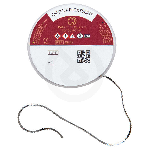Bobina de 75 cm. La última generación en retención lingual utilizando retenedor de oro. - Estabiliza correcciones ortodónticas - Previene recaídas rotacionales - Una aplicación fácil dado que conforma naturalmente a la arcada - Menos tiempo en el sillón - Más bajo nivel de fracaso debido a un encadenado flexible - Un ahorro en costes de laboratorio - Más comodidad para el paciente dado que tiene un perfil muy bajo y plano - Una estética duradera debido a su composición oro de 14 quilates. Dimensiones: 0.974 mm (ancho) x 0.402 mm (alto)