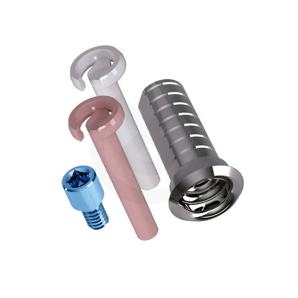 Kit Pilar en Titanio Extragrade Ø 3,5 ,4 y 5 mm; Contenido: 1 Pilar en Titanio Extragrade para pegar H.9,5mm , 1 Tornillo en titanio h.2mm, 2 Seeger Blancos con mango, 1 Seeger Rosa con mango.
