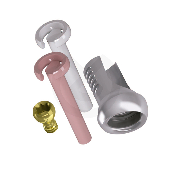 Kit Pilar en Titanio Extragrade Inclinado 15° Ø3,5 y 4 mm; Contenido: 1 Pilar en Titanio Extragrade Inclinado 15° para pegar , 1 Tornillo en titanio p/ pilar extragrade inclinado, 2 Seeger Blancos con mango, 1 Seeger Rosa con mango.