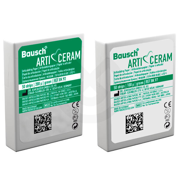 El papel de articular Arti-Ceram es ideal para visualizar claramente los contactos prematuros sobre distintos tipos de cerámica, como por ejemplo de vídrio, de zirconio y feldespática. Está disponible en dos espesores, 200 µm y 100 µm, y en forma de herradura o tiras. Gracias a su color verde es claramente visible y rico en contrastes en las superficies estéticamente pulidas de estas cerámicas gracias a pigmentos de color especiales. Tamaño de la tira: 52 x 20 mm.