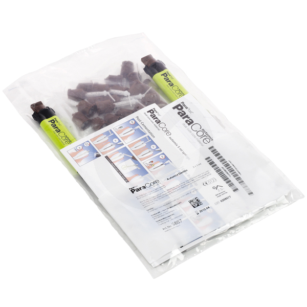ParaCore es un cemento de composite de polimerización dual reforzado con vidrio, es radiopaco y disponible en dos tonalidades: dentina y blanca. Gracias a su consistencia cremosa, suave y que no gotea, ParaCore es el material ideal todo-en-uno. Debido a su tixotrópica formulación, ParaCore es especialmente atractivo para una aplicación a mano alzada. Debido a su densidad, similar a la dentina natural, el tallado no presenta defectos. ParaCore simplifica la técnica de restauración de pernos y muñones, ya que se puede utilizar como material 3 en 1 para cementación de per¬nos, reconstrucción de muñones y cementación de coronas y puentes. ParaCore también puede utilizarse en la cementación de inlays y onlays.