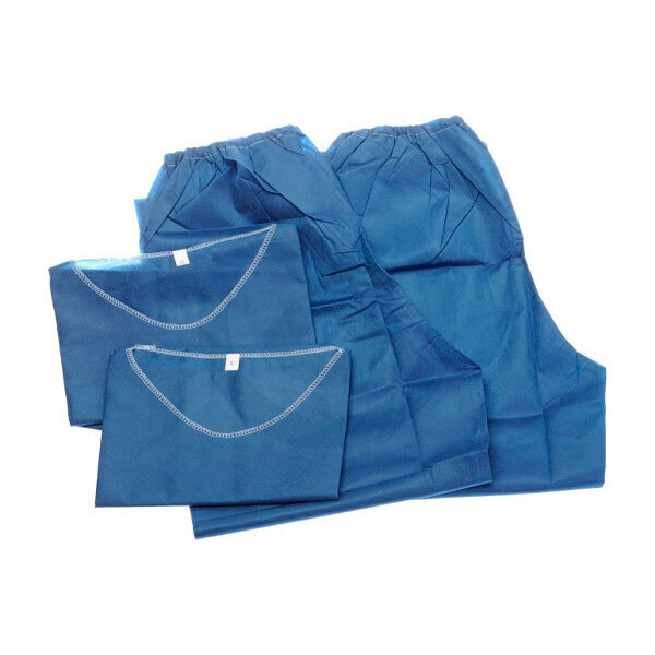Pijama desechable no estéril. Fabricado en tejido SMS, tejido no tejido constituido por filamentos continuos de polipropileno 100%. Gramaje: 38 g. Cómodo y transpirable. Pantalón con goma elástica y chaqueta con escote en pico y 3 bolsillos. Color azul opaco.