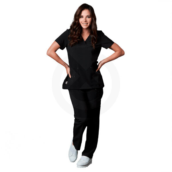 Conjunto sanitario con casaca slim fit de manga corta, cuello en V, multibolsillos y con hebilla portagafete. Pantalón jogger slim fit, resorte y jareta ajustable en cintura y con dos bolsillos delanteros.