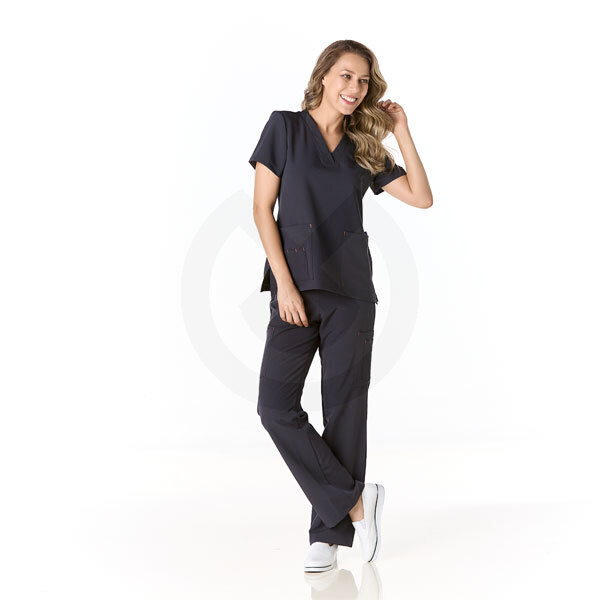 Conjunto sanitario con casaca slim fit de manga corta, cuello en V, multibolsillos y con hebilla portagafete. Pantalón jogger slim fit, resorte y jareta ajustable en cintura y con dos bolsillos delanteros.