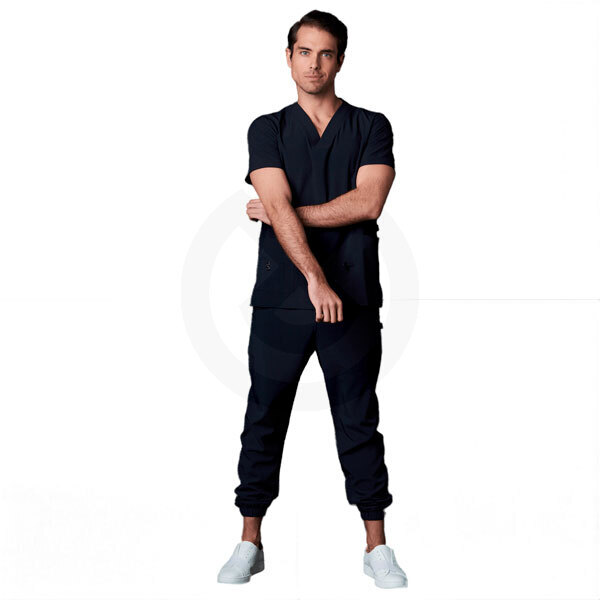 Conjunto sanitario con casaca slim fit de manga corta, cuello en V, multibolsillos y con hebilla portagafete. Pantalón jogger slim fit, resorte y jareta ajustable en cintura y con dos bolsillos delanteros.
