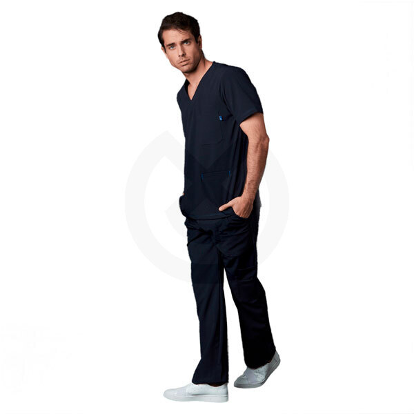 Conjunto sanitario con casaca slim fit recto de manga corta, cuello en V, multibolsillos. Pantalón recto slim fit, resorte y jareta ajustable en cintura, una bolsa cargo con cremallera, dos bolsas delanteras y traseras.
