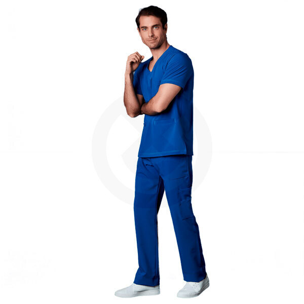 Conjunto sanitario con casaca slim fit recto de manga corta, cuello en V, multibolsillos. Pantalón recto slim fit, resorte y jareta ajustable en cintura, una bolsa cargo con cremallera, dos bolsas delanteras y traseras.