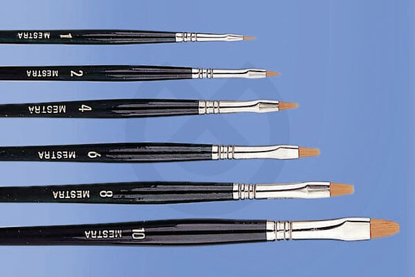 Pinceles de alta calidad, plano de fibra Toray Oro. Mango verde de madera noble y virola de latón niquelado.