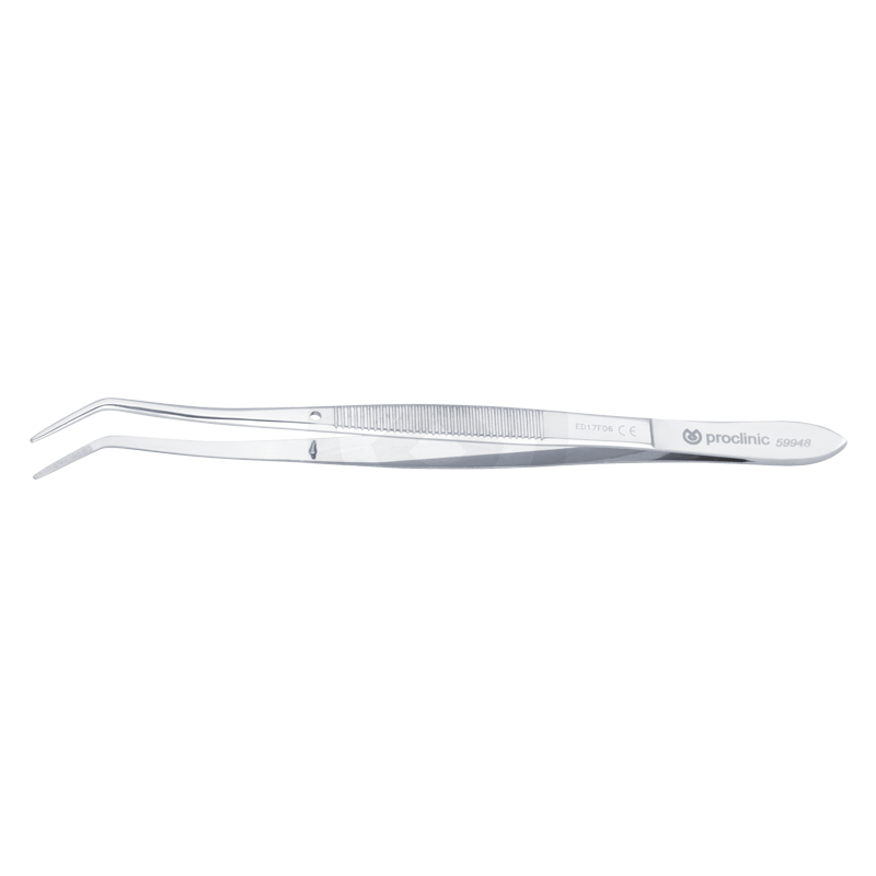 Pinza Meriam con punta estriada. Utilizada normalmente como porta torundas de algodón en procedimientos dentales. Tamaño:16 cm.