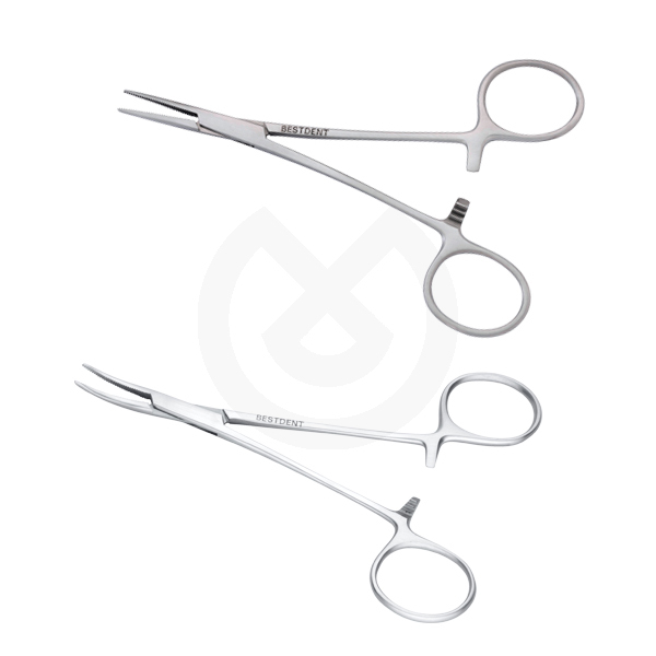 Pinza mosquito curva sin dientes para la compresión de vasos sanguíneos de tamaño pequeño.