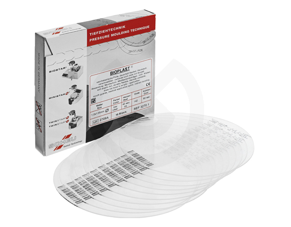 Planchas blandas y elásticas, similares a la goma, ideadas especialmente para la fabricación de férulas de blanqueamiento. No se combinan con resina autopolimerizable. Dureza Shore A:92