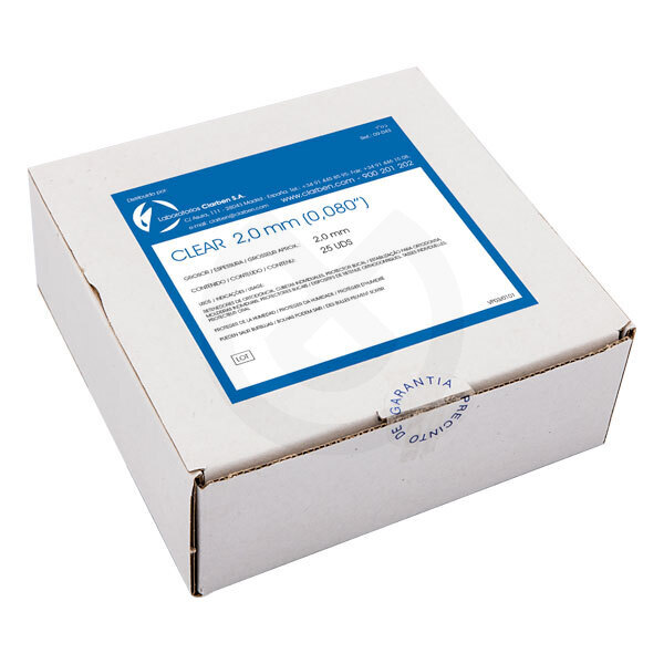 Planchas clear para la elaboración de adaptaciones termoplásticas para fines odontológicos mediante el uso de máquinas de vacío compatibles.