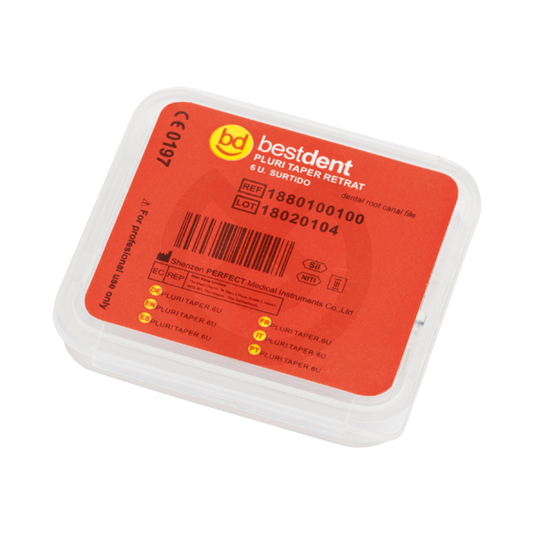 Limas de retratamiento Pluri Taper para la eliminación de la obturación radicular antes de preparar de nuevo el conducto para una reendodoncia. Sistema completo de tres limas, con tres longitudes y tres conicidades progresivas, para actuar en diferentes tercios del conducto radicular. No estériles, esterilizables a 134º. Presentadas en un envase cómodo que permite su almacenamiento.