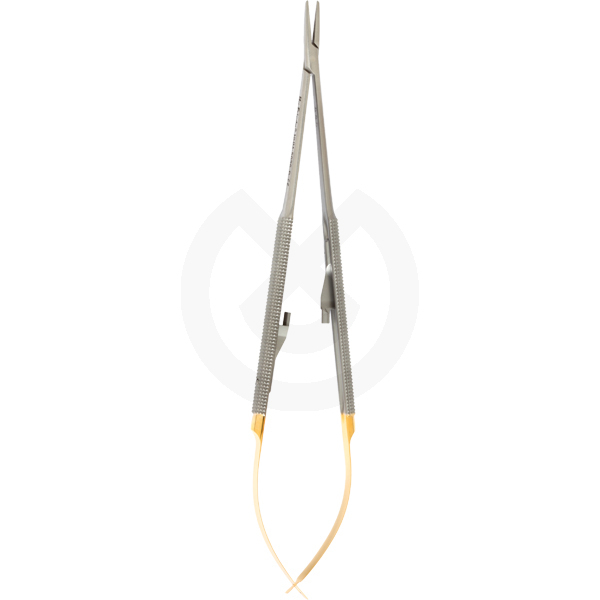 Porta-agujas empleado para sujetar y guiar la aguja al suturar. Micro Castroviejo, recto, con revestimiento de polvo de diamante. 18 cm.
