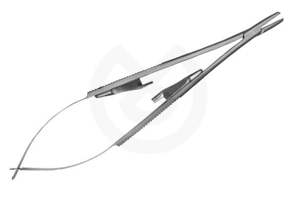 Porta-agujas empleado para sujetar y guiar la aguja al suturar. Tamaño: 14 cm.