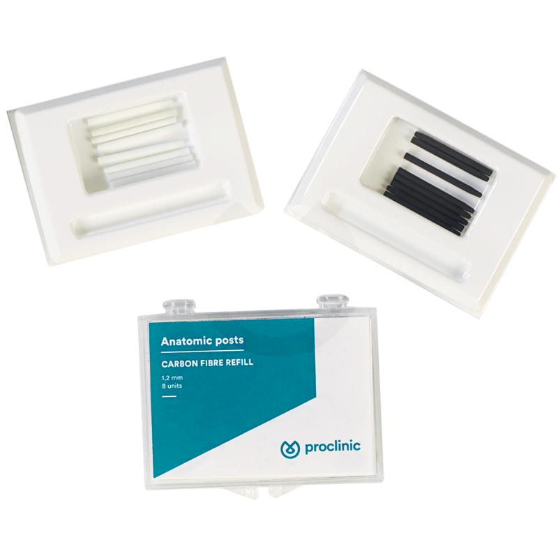 La línea Endodóntica de Proclinic se amplía con los nuevos Postes Anatómicos de Fibra de Vidrio y de Fibra de Carbono que representan una importante innovación para la reconstrucción protésica del diente desvitalizado. Están realizados con una fibra especial de vidrio y matriz resinosa epóxida que presenta una óptima afinidad con el cemento normalmente utilizado para la cementación y reconstrucción del muñón. La amplia gama de dimensiones permite seleccionar el poste que mejor se adapte a la anatomía del canal sin pérdida de dentina radicular. La superficie microrrugosa garantiza un mejor contacto con la superficie del diente, con aumento de la resistencia axial y una coloración similar a la dentina en la zona estética. Características: Módulo de elasticidad similar a la dentina, ausencia de fractura radicular, estructura con fibra longitudinal, ausencia de oxidación y corrosión, forma cilindro-cónica. Ventajas: Fácil remoción del poste en caso de retratamiento, estabilidad y biocompatibilidad, ausencia de fracturas en el poste, uniforme distribución del estrés oclusal.