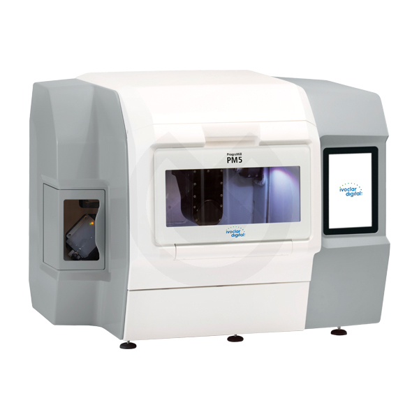 PrograMill PM5 es una máquina universal con cambiador de material integrado de 8 vías para el procesamiento en húmedo y en seco de materiales dentales. La máquina ofrece una combinación de propiedades de mecanizado industrial (sistema de sujeción de punto cero, fresado de 5 ejes, operación mediante PC integrado con pantalla táctil) y diseño moderno integradas en un flujo de trabajo validado.