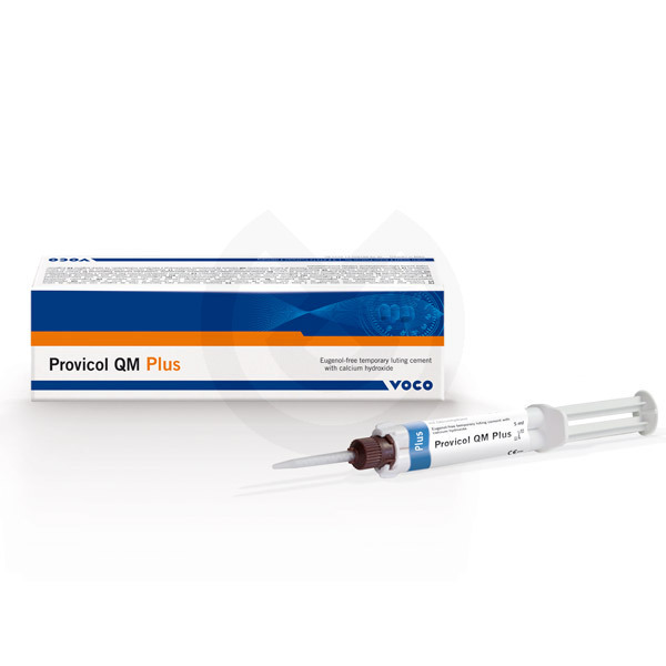 Cemento de fijación temporal con adhesión optimizada libre de eugenol. Contiene hidróxido de calcio y está indicado para la fijación temporal de restauraciones provisionales y definitivas (coronas, puentes, inlays y onlays), así como para el sellado temporal de pequeñas cavidades superficiales. Gracias a su resistencia más elevada, Provicol QM Plus autopolimerizable resulta perfecto para emplear en situaciones clínicas en las que se precisa de una adhesión especialmente firme, desde fijaciones de muñones dentales cortos o pequeños o prótesis provisionales sobre muñones con escasa retención.