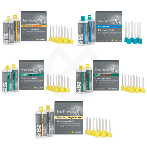 El nuevo Provil Novo convence por su calidad claramente mejorada y una banda de indicaciones ampliada. Los componentes Provil Novo establecen así estándares nuevos y satisfacen todas las exigencias en lo referente a individualidad y diversidad en los campos de indicación. En este sentido la configuración modular de las viscosidades de Provil Novo, formuladas para combinarse de forma ideal, garantiza la aplicación óptima para todo tipo de situaciones y técnicas de impresión en clínica. Suplementariamente, la posibilidad de elegir entre las opciones de fraguado rápido y fraguado normal ofrece la máxima flexibilidad en los tiempos.
