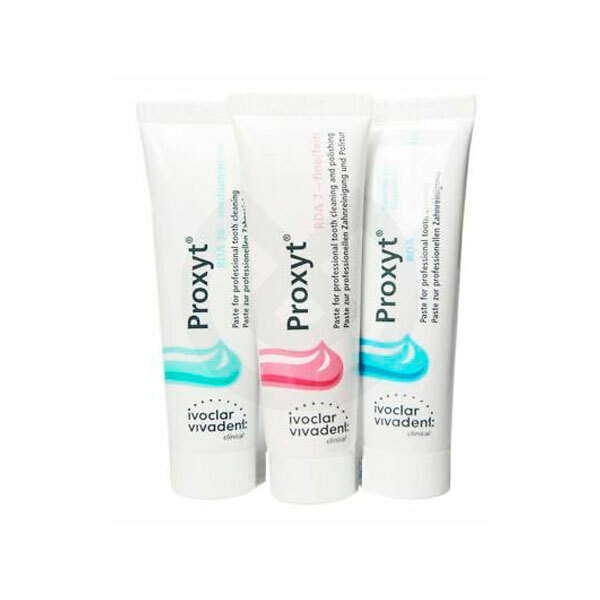 Proxyt fino sin piedra pómez es adecuado para pulir superficies dentales y limpiar restauraciones e implantes. La pasta es suave con las encías y el tejido peri-implantario.