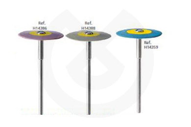 Pulidor diamantado para cerámica, disilicato de litio, zirconio y titanio. Maxima eficacia aplicando los tres pasos. Textura: 1- Azul grueso. 2-Rosa medio. 3-Gris fino. Forma: Llama: 4x13mm. Rueda: 11x2mm. Disco: 26x2mm.