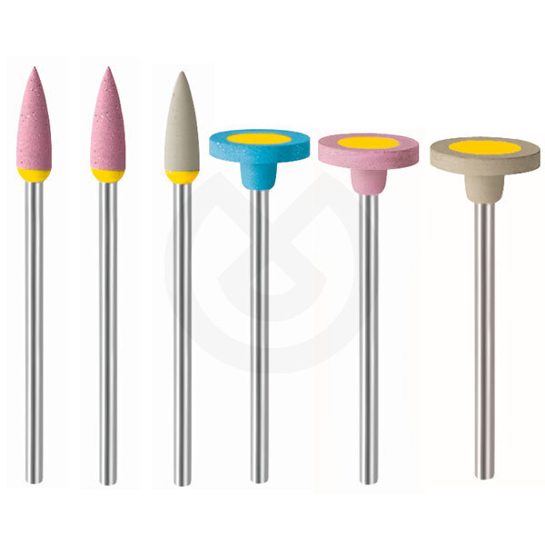 Pulidor diamantado para cerámica, disilicato de litio, zirconio y titanio. Maxima eficacia aplicando los tres pasos. Textura: 1- Azul grueso. 2-Rosa medio. 3-Gris fino. Forma: Llama: 4x13mm. Rueda: 11x2mm. Disco: 26x2mm.