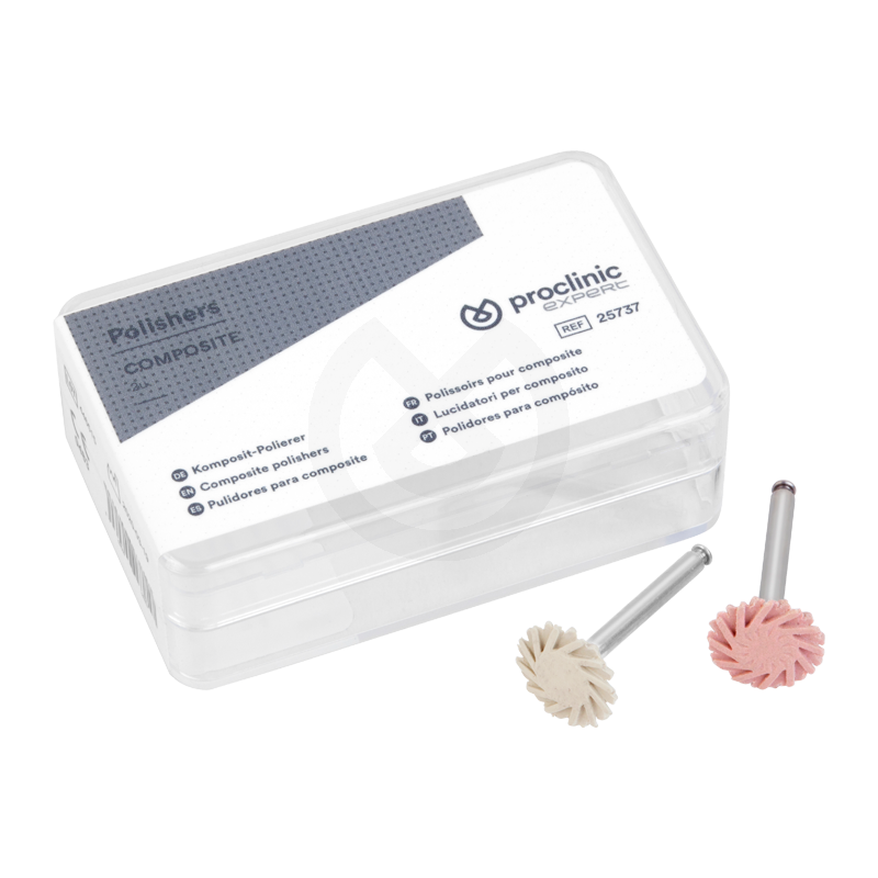 Sistema de pulido de composites en 2 pasos. Ideal para dar el brillo final a restauraciones hechas con composite. Pulidores diseñados para cada paso del pulido. Pulidor de grano medio en color rosa para el pre-pulido, pulidor fino en color claro para el pulido de brillo. Para C.A, 11 mm de diámetro.