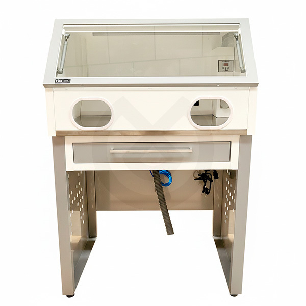 Cabina de repasado dental, metálica, ergonómica, funcional y económica. Va equipado con aspiración Jeb (con regulador de potencia), soplador de aire, toma de corriente, agujeros para pasar micromotor y luz Led con protección para partículas. La puerta es de cristal solido con sistema abatible. La encimera es acero inoxidable.