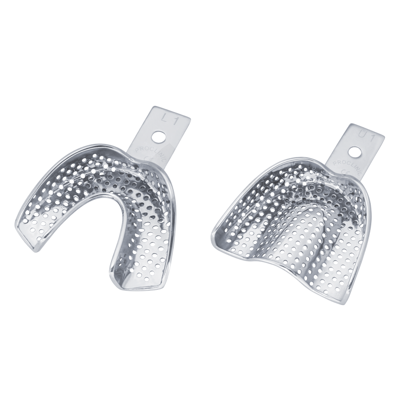 Reposición cubeta para la toma de impresiones fabricada en acero inoxidable, perforada y con reborde retentivo.