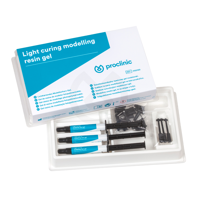 Resina fotopolimerizable para modelar en forma de gel para indicaciones múltiples en el sector dental, especialmente para la técnica de moldear formas. La aplicación del gel utilizable se realiza utilizando el inyector de dosificación. El producto es apropiado para el templado con los aparatos habituales de fotopolimerización. Después del endurecimiento final se puede pulir con un micromotor y con equipos de fresado. El producto funde sin dejar residuos durante el precalentamiento del molde. 100% calcinable.