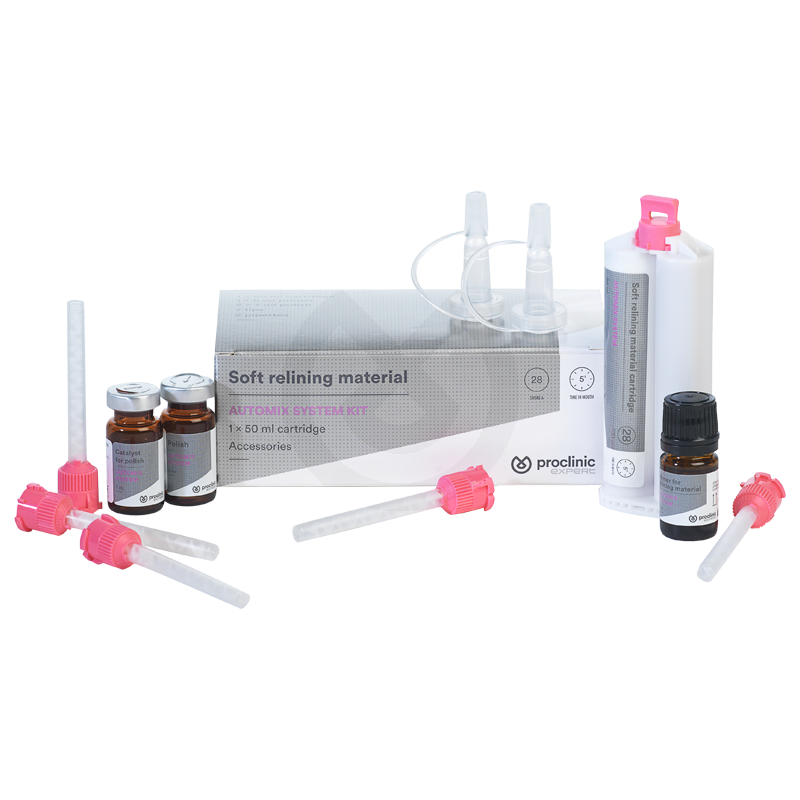 Material de rebase permanente en cartuchos, de silicona A blanda y de curado frío, para mejorar la comodidad y falta de retención de las prótesis de forma rápida y sencilla en una sola sesión. El Rebase Blando Proclinic Expert ha sido desarrollado para realizar rebases blandos directos y permanentes que sean cómodos por un período más largo gracias a su elasticidad permanente que absorbe presiones.