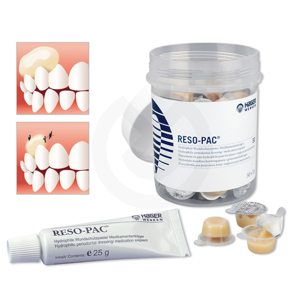 Reso-Pac es un adhesivo periodontal hecho de celulosa ideal para la protección de heridas y suturas en implantología, periodoncia, extracciones, ortodoncia y prostodoncia. Protege y aísla el área de bacterias y facilita el proceso de cicatrización. No es necesario mezclarlo, no tiene ni olor ni sabor y no requiere que se extraiga ya que se va disolviendo. Una vez aplicado, aguanta más de 30 horas. Reso Pac está disponible en bote de 50 cápsulas.