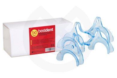 Retractor de mejillas con depresor lingual fabricado en plástico de color azul y esterilizable en autoclave a 134ºC.