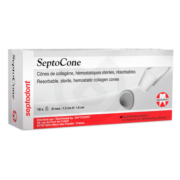 - El colágeno reabsorbible estéril SeptoCone se utiliza como agente hemostático después de una extracción o una cirugía oral.